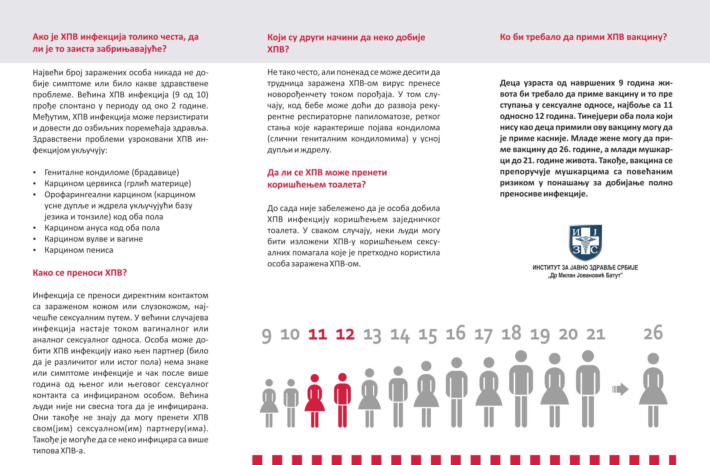 У нашој земљи је на основу Стручно-методолошког упуства препоручено да сва деца узраста 11, односно 12 година, треба да приме препоручене дозе ХПВ вакцине. Тинејџери оба пола који нису као деца примили ову вакцину могу да је приме касније. Младе жене могу да приме вакцину до 26. године, а млади мушкарци до 21. године живота. Такође, вакцина се препоручује мушкарцима са повећаним ризиком у понашању за добијање полно преносиве инфекције.