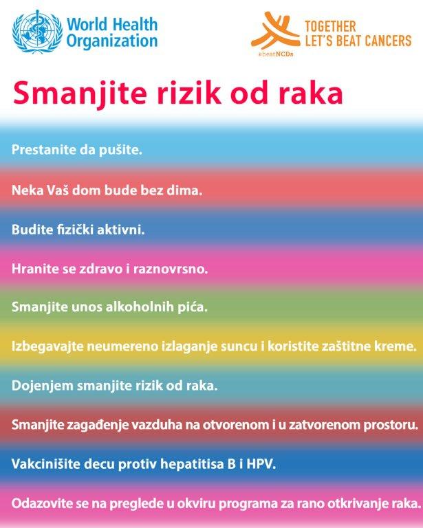 - Više od 1/3 svih slučajeva raka je posledica gojaznosti, nepravilne ishrane i fizičke neaktivnosti. Skoro 1/5 odraslog stanovništva Srbije je gojazna (indeks telesne mase ≥30). Prekomerna telesna težina i gojaznost povećavaju rizik od nastanka raka tela materice, debelog creva, dojke (kod žena u menopauzi) i prostate kod muškaraca.