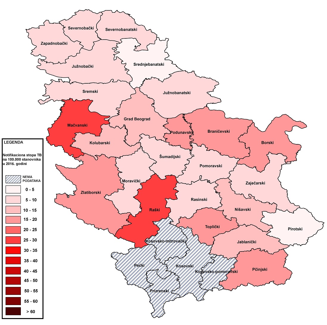 Republika Srbija beleži kontinuiran trend smanjenja stope prijavljivanja tuberkuloze, sa 37/100.000 u 2003. godini na 12/100.000 stanovnika u 2016. godini, što je svrstava među zemlje sa niskim opterećenjem tuberkulozom u regionu Evrope.